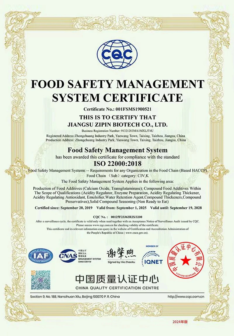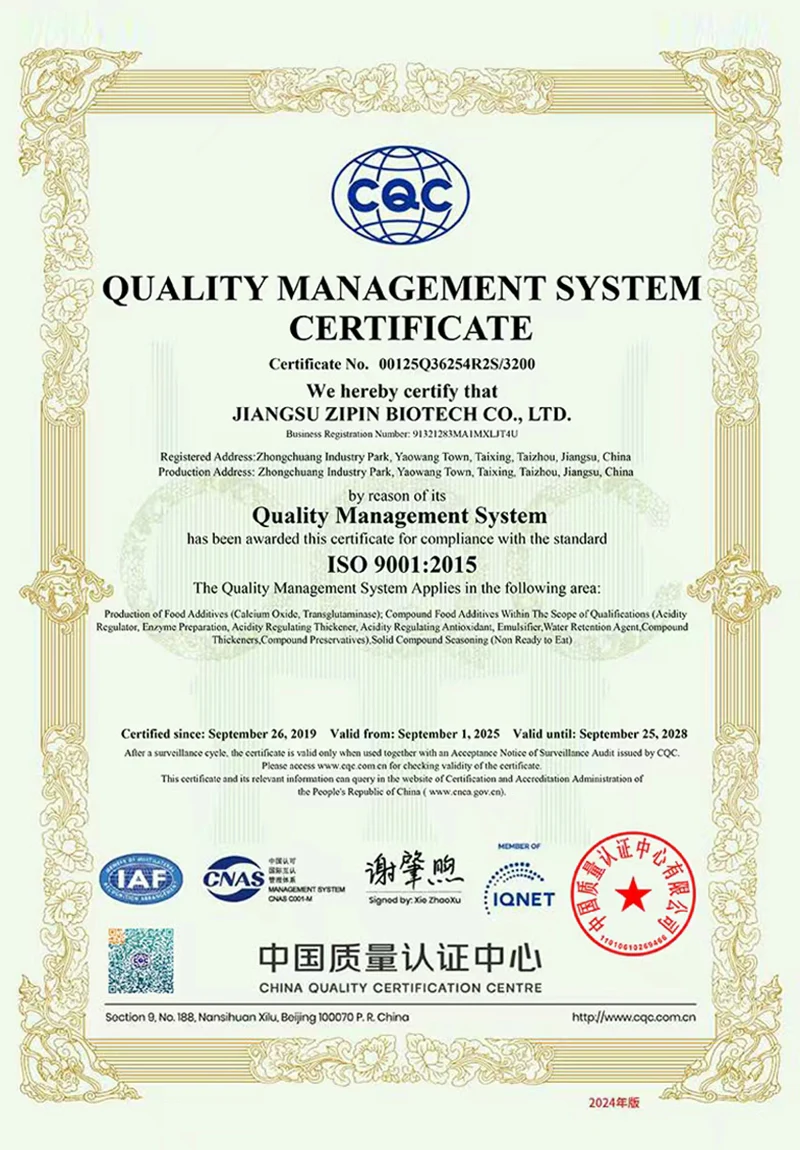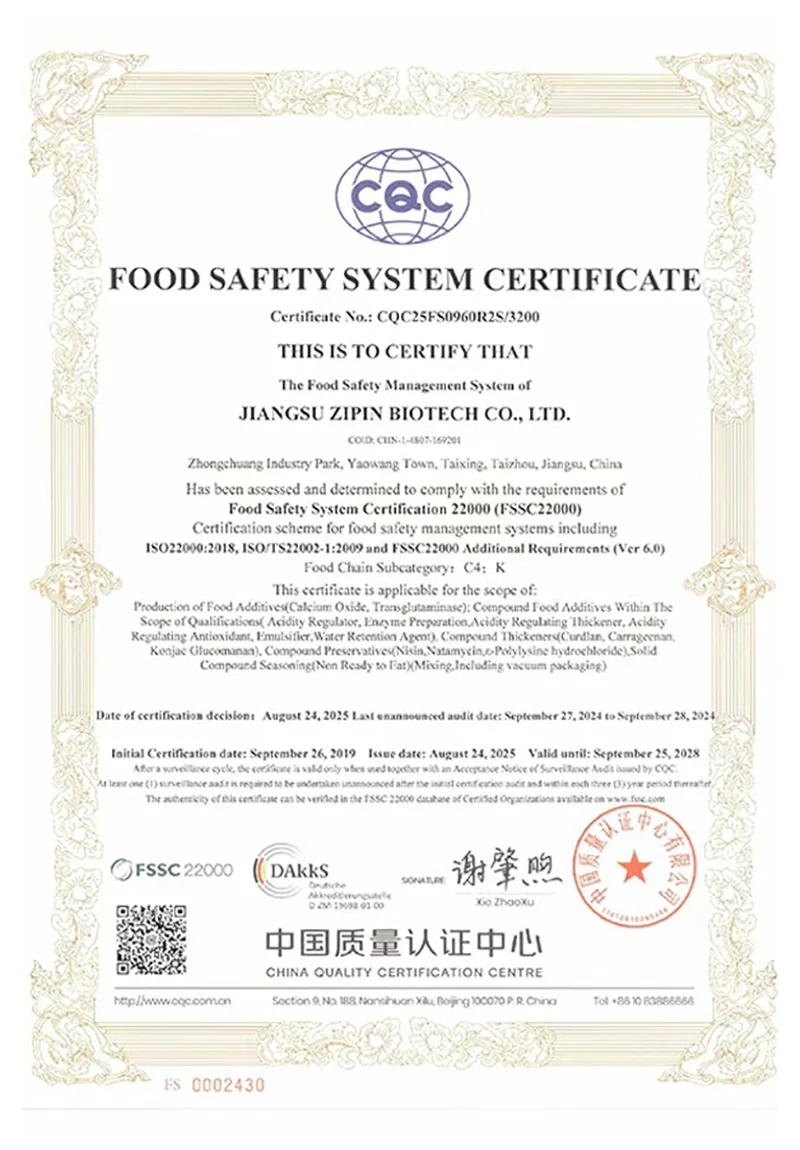 Jiangsu Zipin Biotech Co.,Ltd. ble etablert i 2016, og dekker et område på 20 000㎡. Som en moderne privat bedrift er vi nå hovedsakelig engasjert i FoU, produksjon og salg av mattilsetningsstoffer. Våre hovedprodukter erTransglutaminase, Curdlan, e-polylysin, Nisin, Natamycin og andre mattilsetningsstoffer.