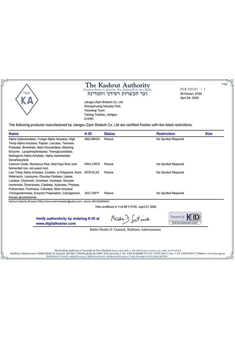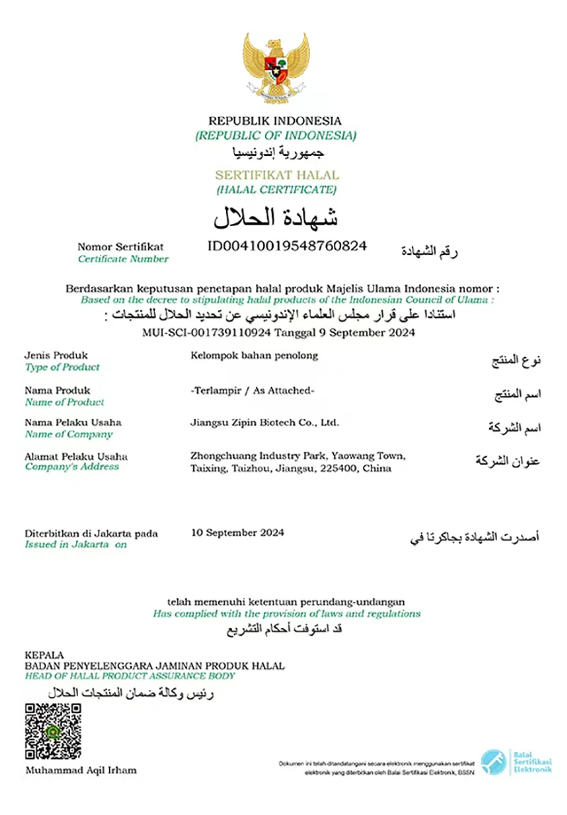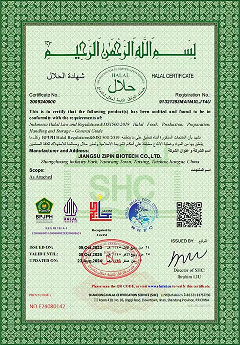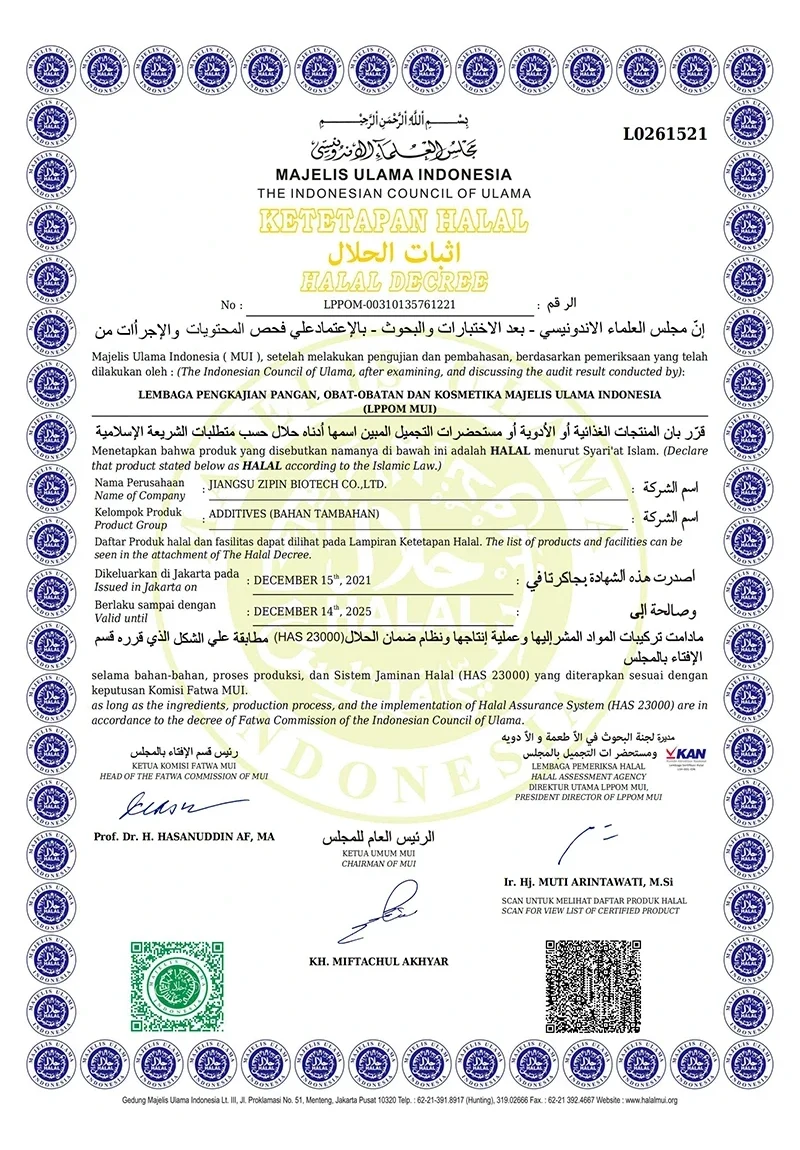 Jiangsu Zipin Biotech Co.,Ltd. ble etablert i 2016, og dekker et område på 20 000㎡. Som en moderne privat bedrift er vi nå hovedsakelig engasjert i FoU, produksjon og salg av mattilsetningsstoffer. Våre hovedprodukter erTransglutaminase, Curdlan, e-polylysin, Nisin, Natamycin og andre mattilsetningsstoffer.